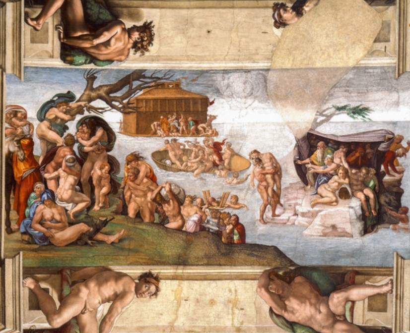 Entrando nella Cappella Sistina e volgendo lo sguardo verso l’alto vi sarete accorti che manca una porzione di affresco abbastanza grande che coinvolge parte del riquadro con il Diluvio Universale e l’Ignudo adiacente, prossimo alla Sibilla Delfica.