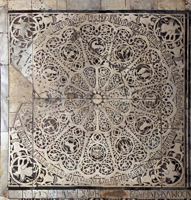 Well, even the floor is a masterpiece that is well worth a careful observation. In the direction of the Gates of Paradise you can admire the fascinating square decorated with the twelve signs of the zodiac. In the center, the sun around which a palindrome phrase is shown, that is, readable in the same way in both senses.