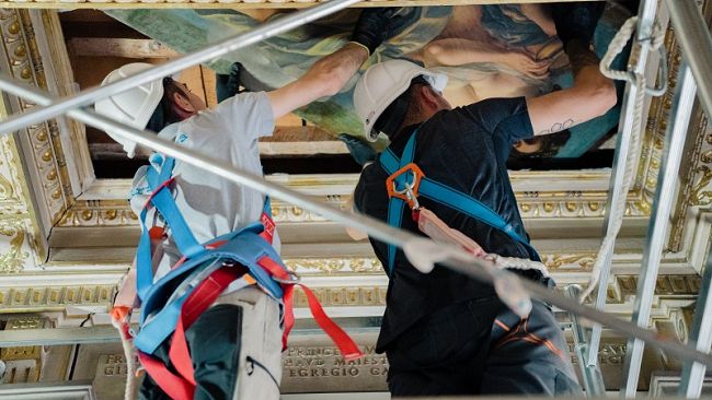 To carry out the restoration, the canvas was removed from its usual location on the ceiling and visitors to Casa Buonarroti will have the opportunity to see it up close during all phases of the intervention.