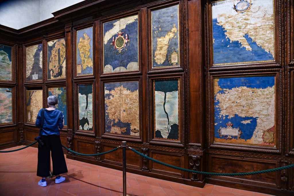 La Sala delle Carte Geografiche è uno degli ambienti più visitati di Palazzo Vecchio. Le 53 carte geografiche dipinte a olio su tavola sono inserite negli sportelli degli armadi e propongono una rappresentazione assai dettagliata delle terre e dei mari conosciuti ai tempi di Cosimo I. Raffinati cartigli e scritte dorate ma anche creature mitologiche impreziosiscono ogni carta.