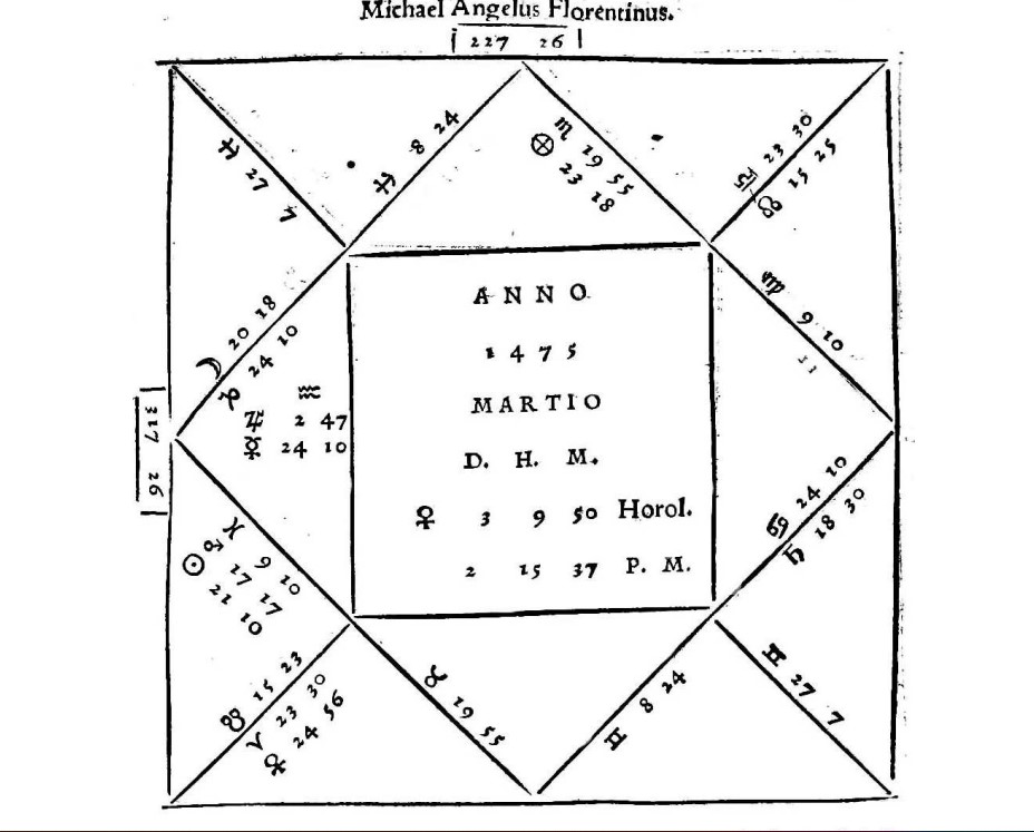 Visto che il Condivi diede alle stampe la mia biografia nel 1553, diversi anni dopo la pubblicazione del Tractatus Astrologicus di Gaurico, è molto probabile che lo abbia ripreso per scrivere l’oroscopo mio. Non si spiegherebbe altrimenti la coincidenza dei due quadri astrologici dato che il Condivi di costellazioni ne sapeva quanto me.