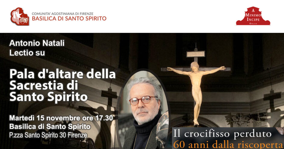 Nell’ambito delle celebrazioni per i 60 anni dalla riscoperta del mio Crocifisso ligneo, questo pomeriggio di martedì 15 novembre alle ore 17,30 nella Basilica di Santo Spirito, si terrà una conferenza del Prof. Antonio Natali dal titolo Pale d’altare della Sacrestia di Santo Spirito nel corso della quale sverrà approfondita anche la conoscenza della pala di Giovanni Maria Butteri alla luce del recente restauro.