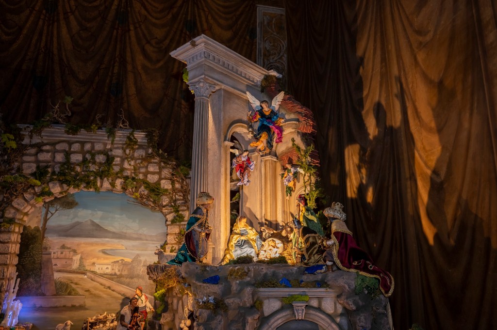 The crib was made in the Neapolitan style of the late eighteenth century and appears as if you were looking out a window that opens onto the daily life of the time. Like any self-respecting Neapolitan nativity scene, each character inserted in the scene has its own symbolic value (I told you about it here).