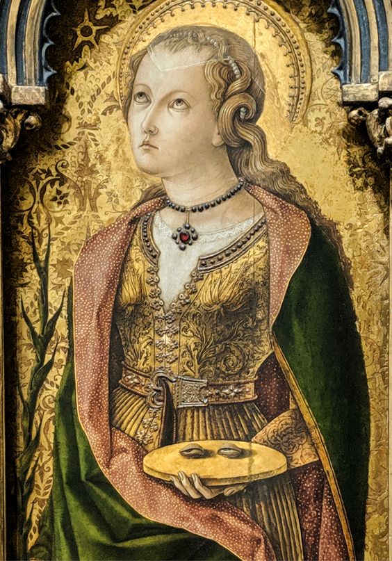 Carlo Crivelli painted Saint Lucia in the Minor Polyptych of San Domenico dated around 1476, now dismembered and kept partly in the National Gallery in London and partly in the Museum of Fine Arts in Budapest. The tempera on panel work in which Saint Lucia is seen is located in London.