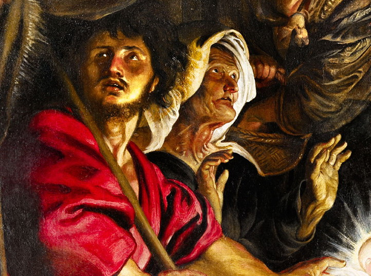 Una signora anziana al centro sostiene un bastone con una mano e con l’altra cerca di proteggersi in qualche modo da quella luce abbagliante emanata dal Bambino: un dettaglio particolare che non passa inosservato.