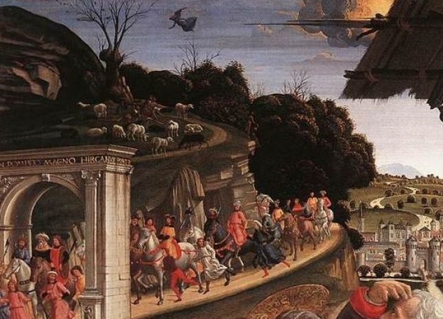 St. Joseph watches the procession that is arriving in the distance while three shepherds can be seen on the right. In particular, the shepherd who indicates the Child with his left hand bringing the other to his chest is Domenico Ghirlandaio who wanted to be included in the work in this way.
