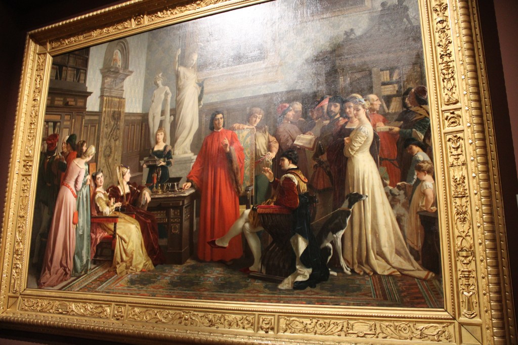 Appena si entra nella mostra ci si trova faccia a faccia con il grande dipinto a olio su tela di Amos Cassioli che rappresenta Lorenzo de’ Medici abbigliato con una veste rossa mentre propone a Galeazzo Sforza le suppellettili artistiche che ha raccolto e collezionato nel corso degli anni. Il dipinto realizzato nel 1868 appartiene alla Collezione Chigi della Banca Monte dei Paschi di Siena.