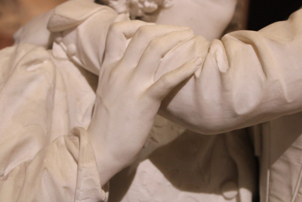 La cosa che colpisce di più di questo gruppo scultoreo è l’accurata resa dei dettagli. Le stoffe damascate e ricamate, le calze a righe di Faust, il pizzo raffinatissimo del fazzoletto di Margherita e quel particolare dello sgabello che si solleva dal pavimento reggendosi solo sulle gambe anteriori sotto l’impeto di passione di lui: ogni dettaglio suscita stupore.