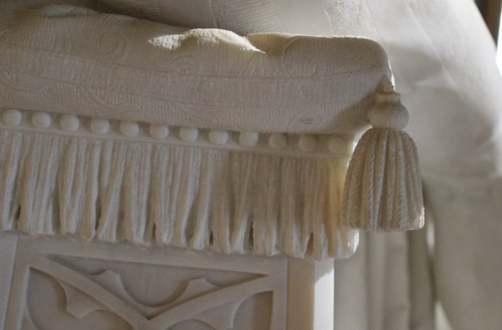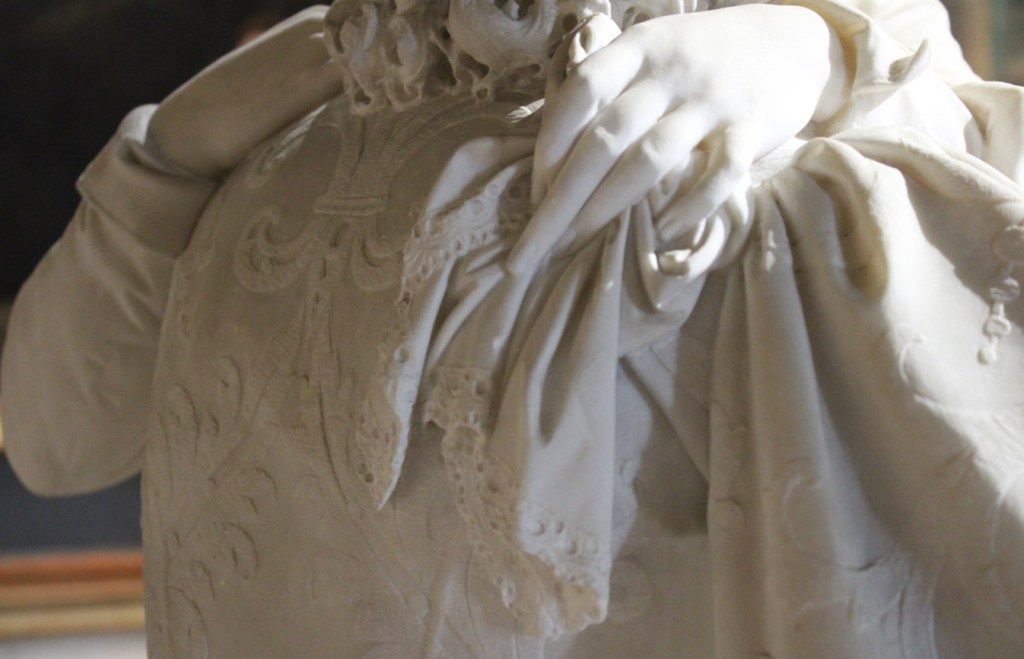 The most striking thing about this sculptural group is the accurate rendering of the details. The damask and embroidered fabrics, Faust’s striped stockings, the highly refined lace of Margherita’s handkerchief and that detail of the stool that rises from the floor by standing only on its front legs under his surge of passion: every detail arouses amazement.