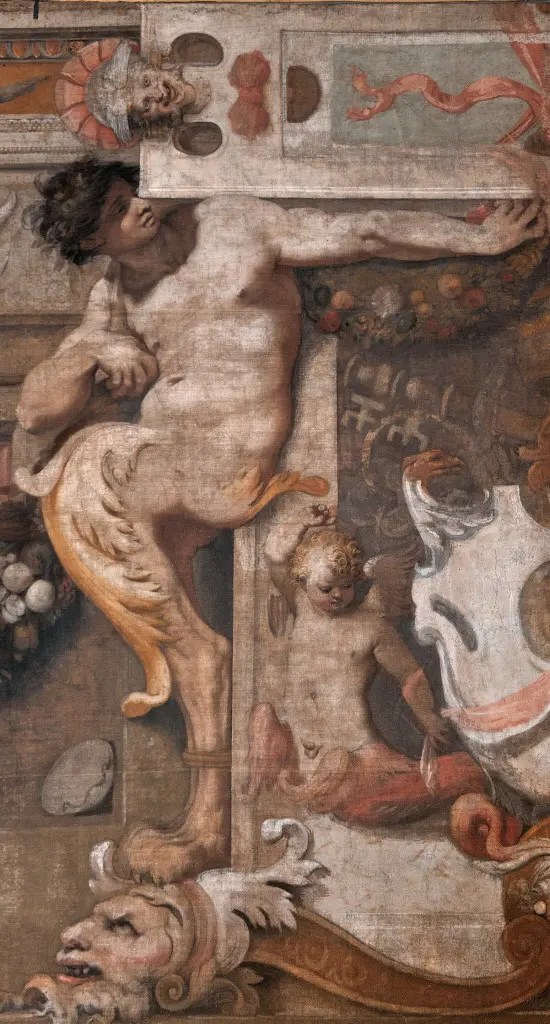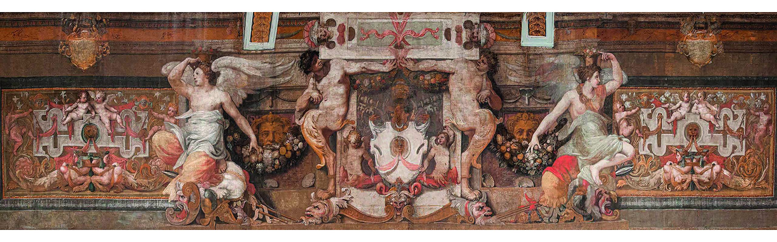The cardinal in his Palazzo Spada had a small study specially built to house that work. While the lower part of the room was covered with precious essences, the canvas was positioned at the top. the two artists Andrea Gennaroli and François Perrier continued Vaga’s work along the other walls of the study in order to create a unique frieze.