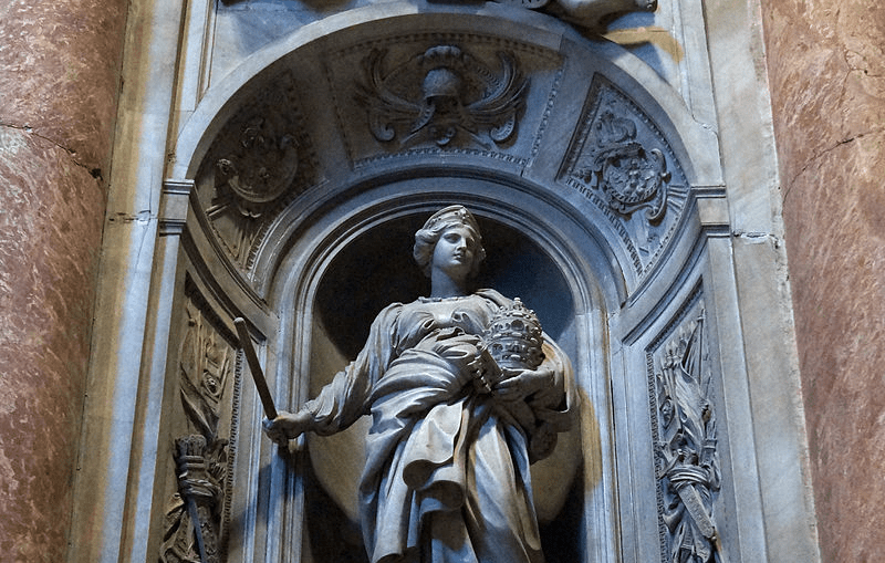 The sculpture portrays the Countess Matilde as defender of the entire papacy. In her right hand she holds her baton of command while in her left she holds the keys of St. Peter and the papal tiara of Urban VII complete with bees, emblem of the Barberini.
