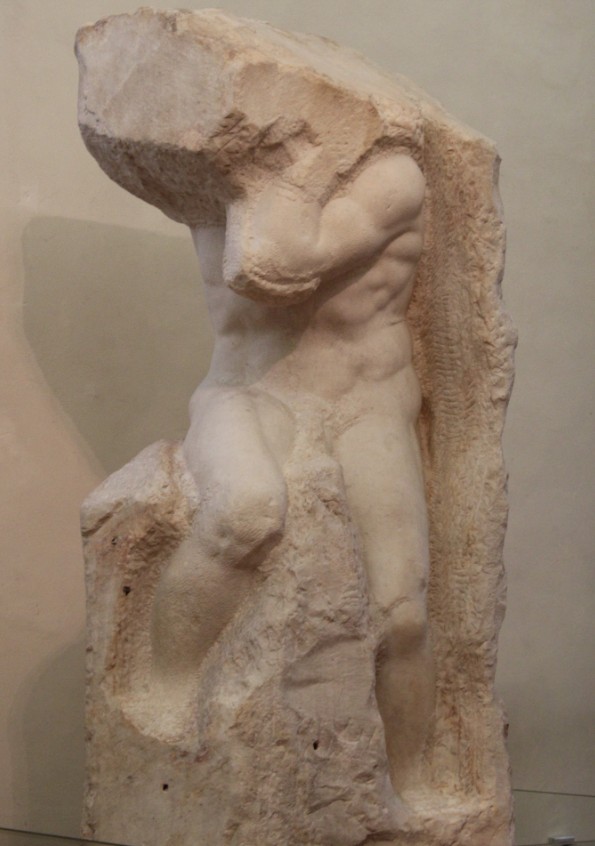 Il Prigione Atlante, destinato in origine alla maestosa Tomba di Giulio II, è uno degli schiavi più particolari. Ha ancora il volto e la parte alta del corpo intrappolata nel blocco di marmo grezzo tanto da farlo sembrare Atlante, piegato sotto il peso del cielo che Zeus condannò a sostenere per l’eternità.