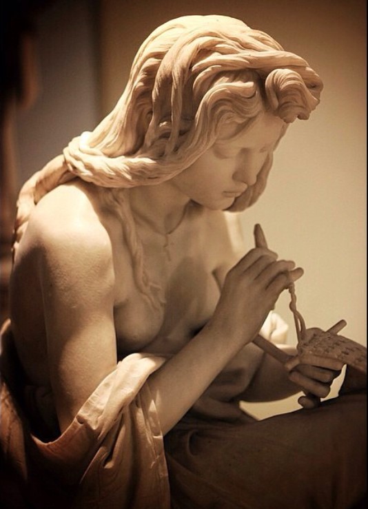 La scultura raffigura una donna che, a capo chino, sta lavorando a una raffinata rete. La giovane concentrata sul proprio lavoro ha una veste drappeggiata che le scivola dalle spalle lasciandole i seni a vista.