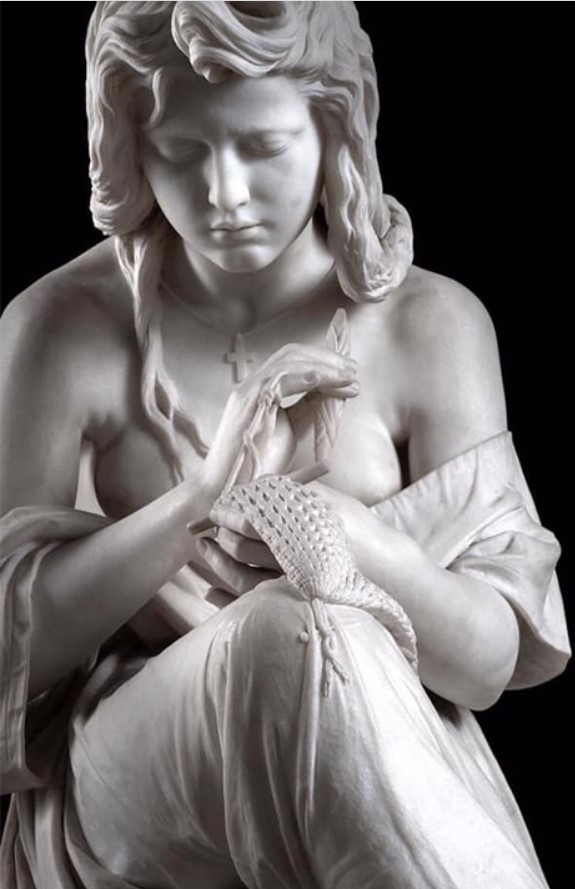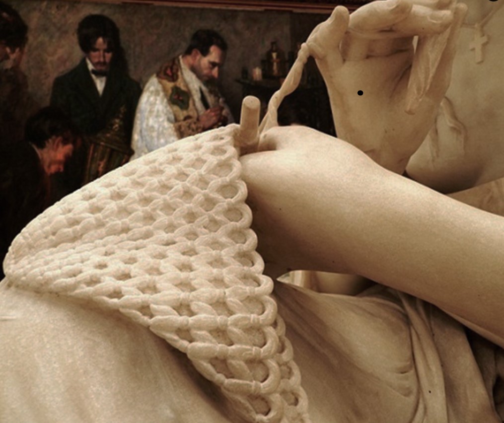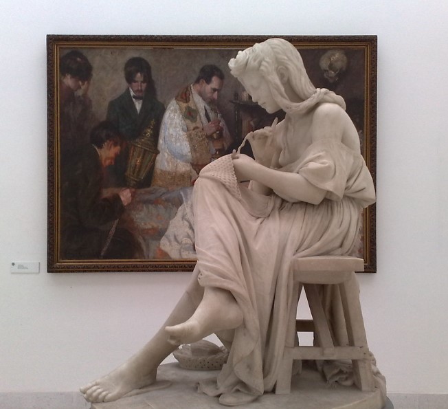 The sculpture depicts a woman who with bowed head is working on a refined net. The young woman concentrated on her work has her dress slipping from her shoulders leaving her breasts exposed.