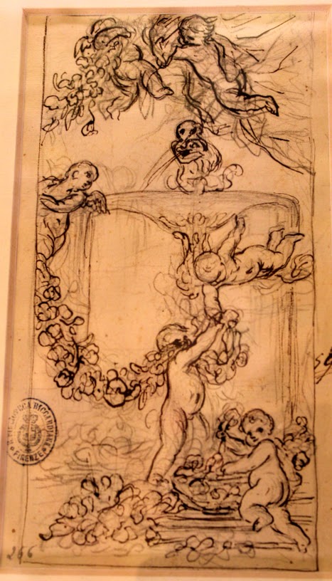 Il disegno dei Putti che girano intorno alla Fontana è molto più articolato e dettagliato rispetto poi al dipinto realizzato e ha una maggiore decoratività relativa soprattutto alle ghirlande di fiori che poi dipinse materialmente Bartolomeo Bimbi.
