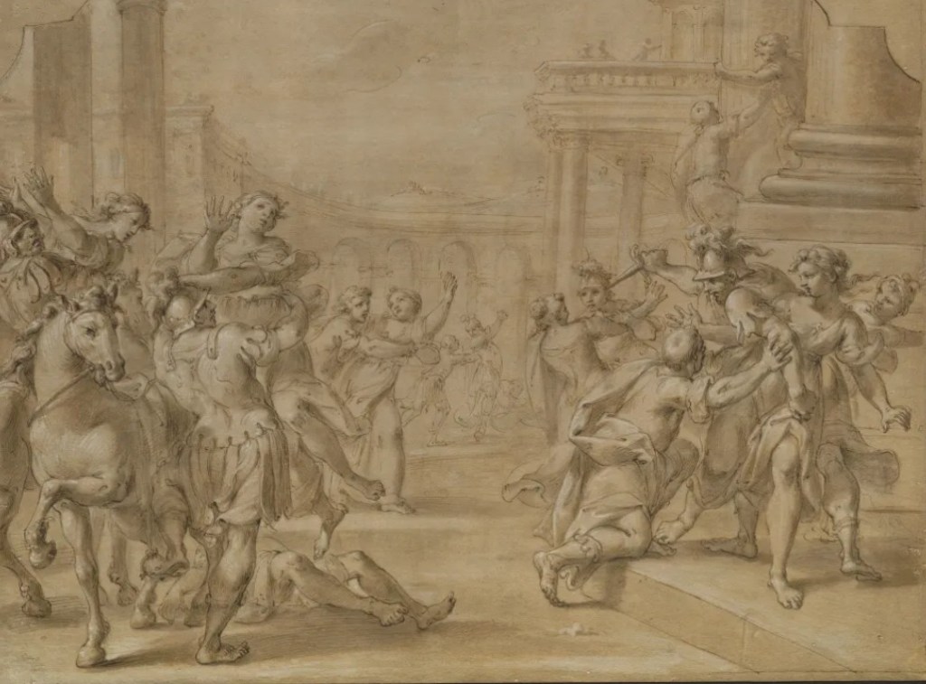These include the Four Seasons from the Pinacoteca Nazionale di Bologna and the Drunkenness of Noah, now in a private collection. The exhibition is completed by a miniature portrait with the head of a young woman preserved in the Davia Bargellini Museum and two lively drawings from the Art and History Collections of the Cassa di Risparmio Foundation in Bologna, the Rape of the Sabine Women and the Rape of Elena, preparatory projects for a large painting to be made in the hall of honor of the house which later belonged to the Buratti merchants, promoters of the arts and of various Bolognese artists. Only the second, dated 1725, was then made by the painter and, as mentioned, opens his documented career.