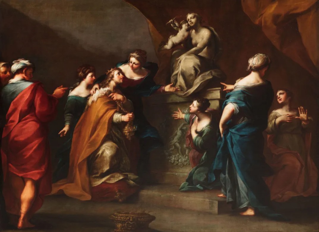 Around two frescoes recently found on the antiques market and exhibited to the public for the first time from a private collection, Moses and the daughters of Jethro and Solomon incensing the idols, other examples of sacred and profane room painting are collected, documenting at the better the youthful style of the artist in the first twenty years of activity.