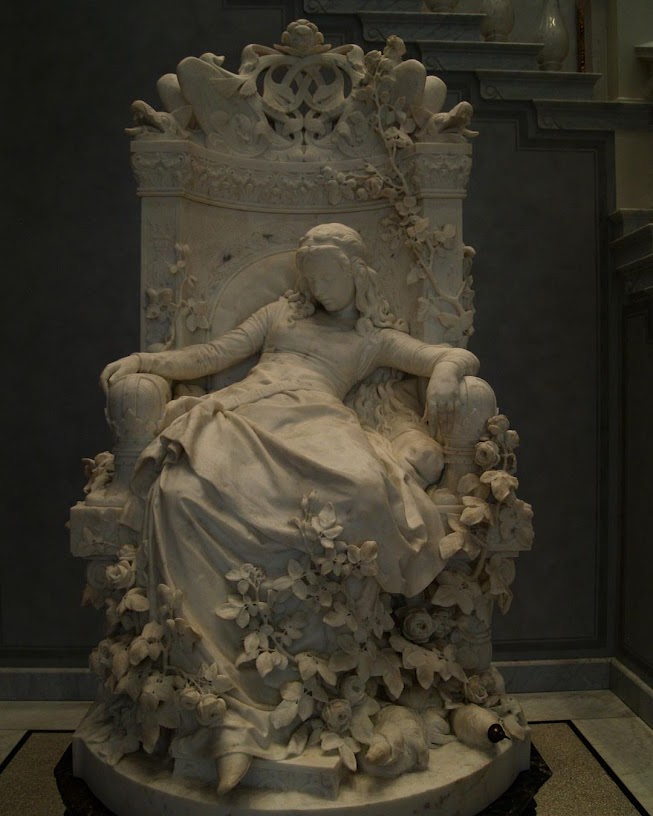 The princess of fairy tales sleeps sitting on a throne carved in marble and surrounded by delicate branches of roses. The work belongs to the Alte Nationalgalerie in Berlin and was created by the artist in 1878.
