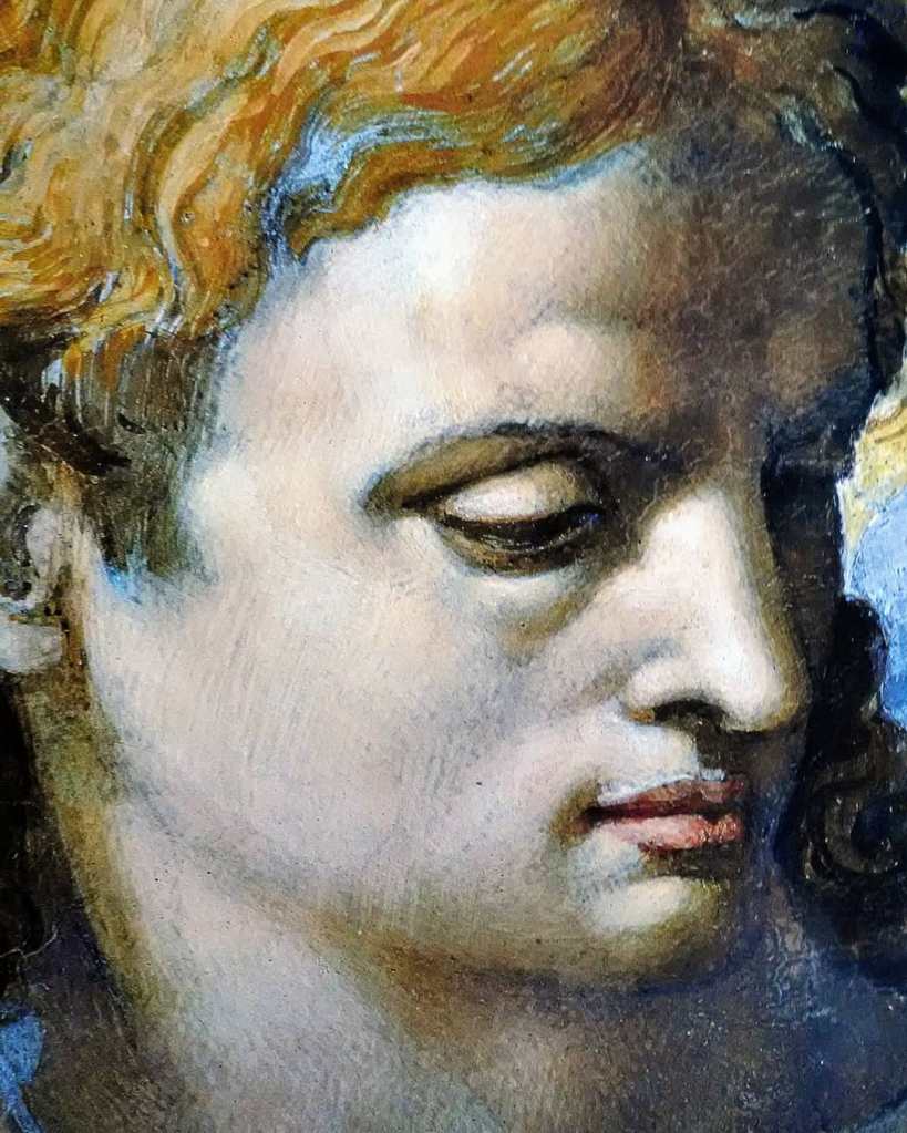 Il 16 aprile del 1535 iniziai ufficialmente i lavori per il Giudizio Universale, con la realizzazione dei ponteggi. Seguirono diversi mesi in cui la parete dovette essere preparata per accogliere l’affresco: prima feci scalpellare via gli affreschi miei e del Perugino che già decoravano il muro e altre vicissitudini che non vi sto qui a raccontare altrimenti si fa notte.