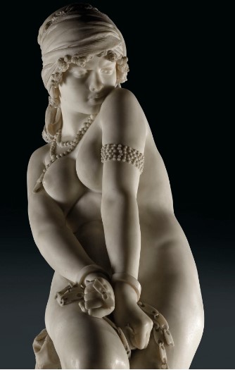 The Carrara marble sculpture depicts a young enslaved woman who is trying to free herself from the chains that tighten her wrists.