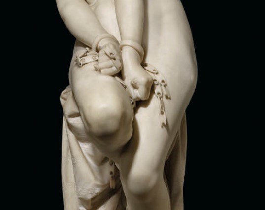 La scultura in marmo di Carrara raffigura una giovane donna fatta schiava che sta provando a liberarsi dalle catene che le stringono i polsi.