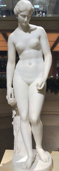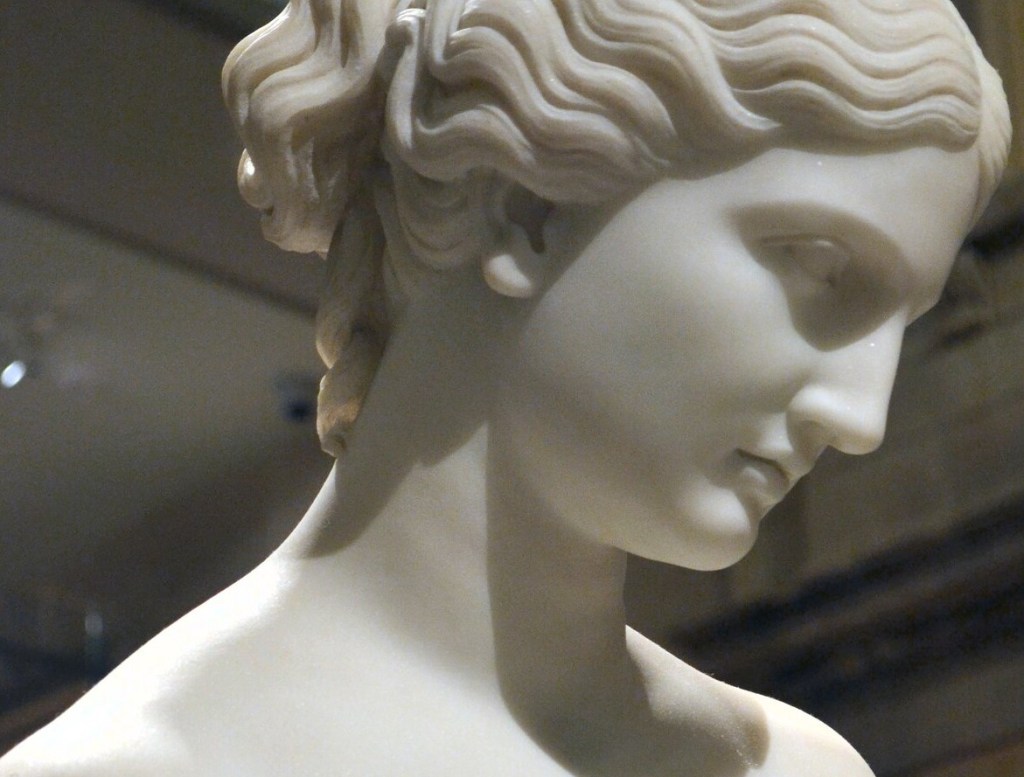 Rinehart wanted to sculpt the story of Clizia in white marble, inspired by Ovid’s narration. He depicted the naked young woman standing and looking down, sad at having lost her love for her.