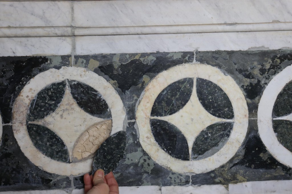 L’altare presentava un’alterazione estesa in corrispondenza della cornice marcapiano, degli archi e della zoccolatura che appoggia sul sedile di marmo.