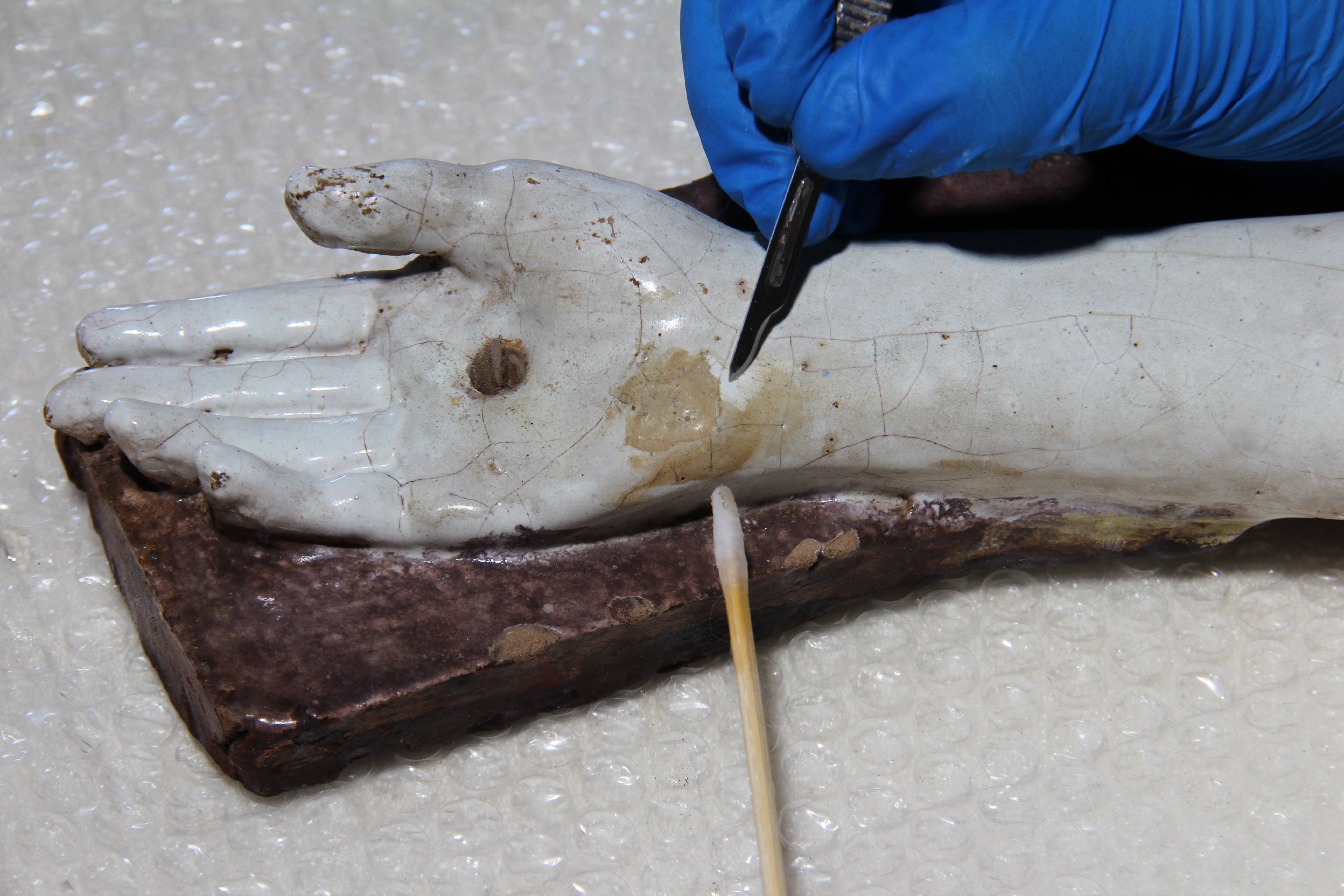 In addition to a high layer of atmospheric deposits, the Crucified Christ had old pictorial additions on the loincloth and arms and had a totally detached hand supported by nails.