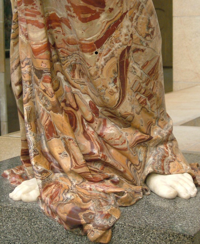 The sculpture was worked by the artist in such a way as to maximize the decorative qualities of the different materials. The veins of the onyx enliven the veil that Nature is taking off while the mottled red marble decorates her dress.