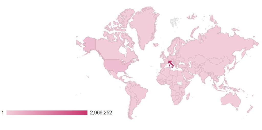 Below I propose the map with all the countries where my words have arrived: in more or less dark pink they are the countries in which I have been read while in white there are the few countries in which I have not yet been able to talk about myself .