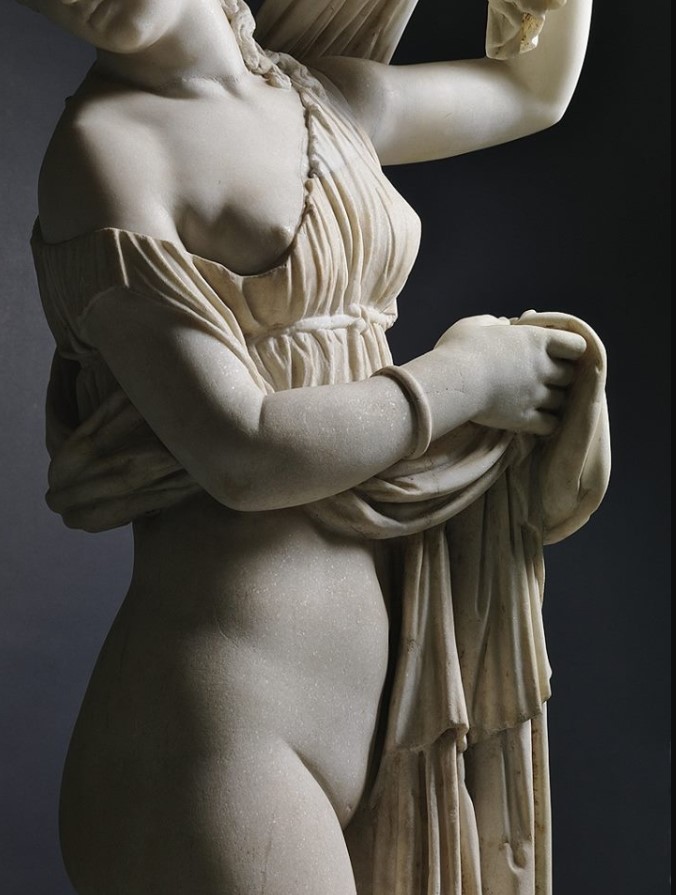 The sensual Venus Callipygia represents the goddess in a mischievous attitude. With her left hand and raised arm, she raises a hem of the thickly pleated chiton, the characteristic sleeveless Ionic tunic of oriental origin, made with a single piece of cloth sewn and usually fastened on the shoulders with a pair of brooches.