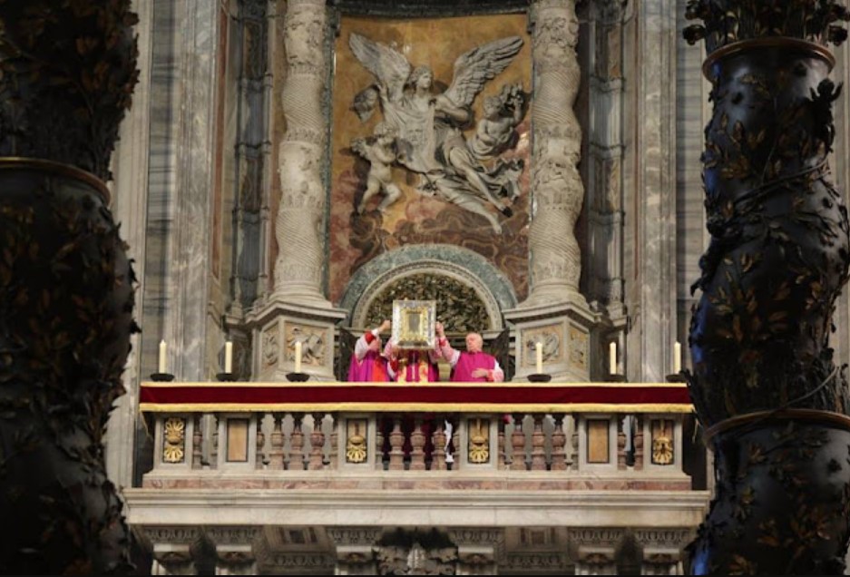 Ora dovete sapere che la reliquia del sudario sul quale è impresso il volto di Cristo, è la reliquia più preziosa delle quattro presenti nelle nicchie superiori dei piloni, accessibili per mezzo di una scala a chiocciola che viene usata dai prelati abitualmente per l’ostensione delle stesse durante la Settimana Santa.