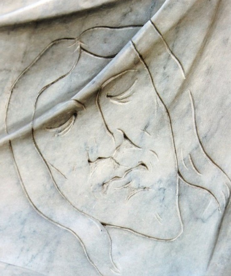 La Veronica scolpita è tutt’altro che quieta. Mentre corre in avanti le vesti le si scompigliano e dalla bocca pare stia uscendo un grido. Mostra il velo con il volto di Cristo tenuto fra le due mani che ha sorpreso pure lei.