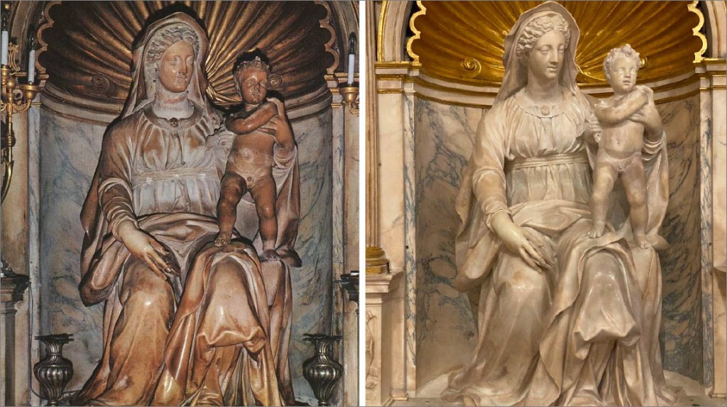 La scultura del Sansovino, oggetto da secoli di devozione per le partorienti, nel corso del tempo è stata continuamente toccata e si era macchiata con l’olio sacro presente nei lumini votivi. Il marmo prima del restauro risutava imbrunito, soprattutto nella figura di Gesù Bambino.