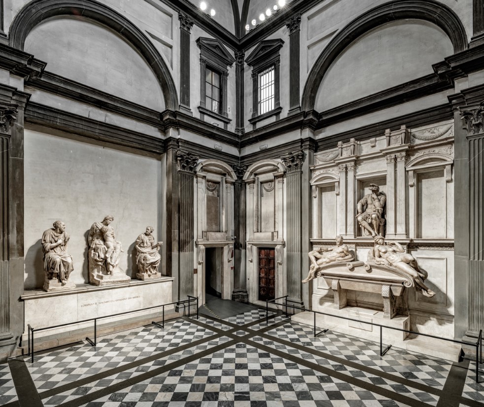 An articulated mausoleum capable of relating all the arts: sculpture in the first place but also architecture, painting and stucco decorations. Entering the Sacristy, one immediately realizes that the colors that dominate it are the white of the marble and the gray of the pietra serena and it is difficult to imagine it in any other way.