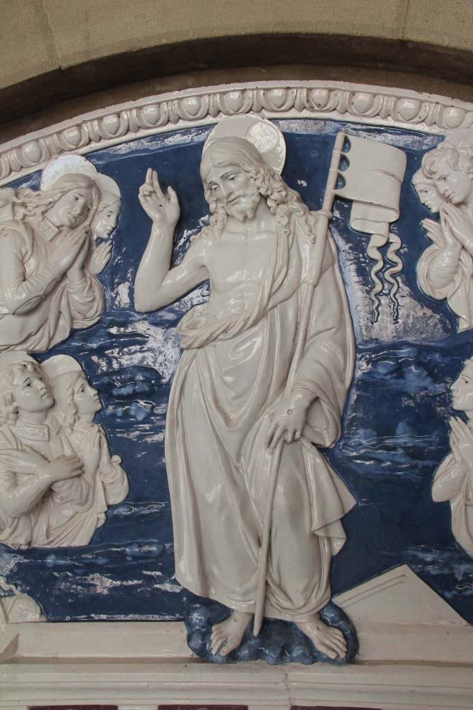 Sulla lunetta dedicata alla Resurrezione è stato necessario rimuovere con acetone anche lo strato di vernice ingiallita. Come nell’altra lunetta anche in questa sono state utilizzate resine acriliche fluorurate per effettuare consolidamenti puntuali in prossimità delle fratture e nelle zone in cui la terracotta era a vista, a cui è seguita la stuccatura eseguita con stucco acrilico a livello della superficie originale.