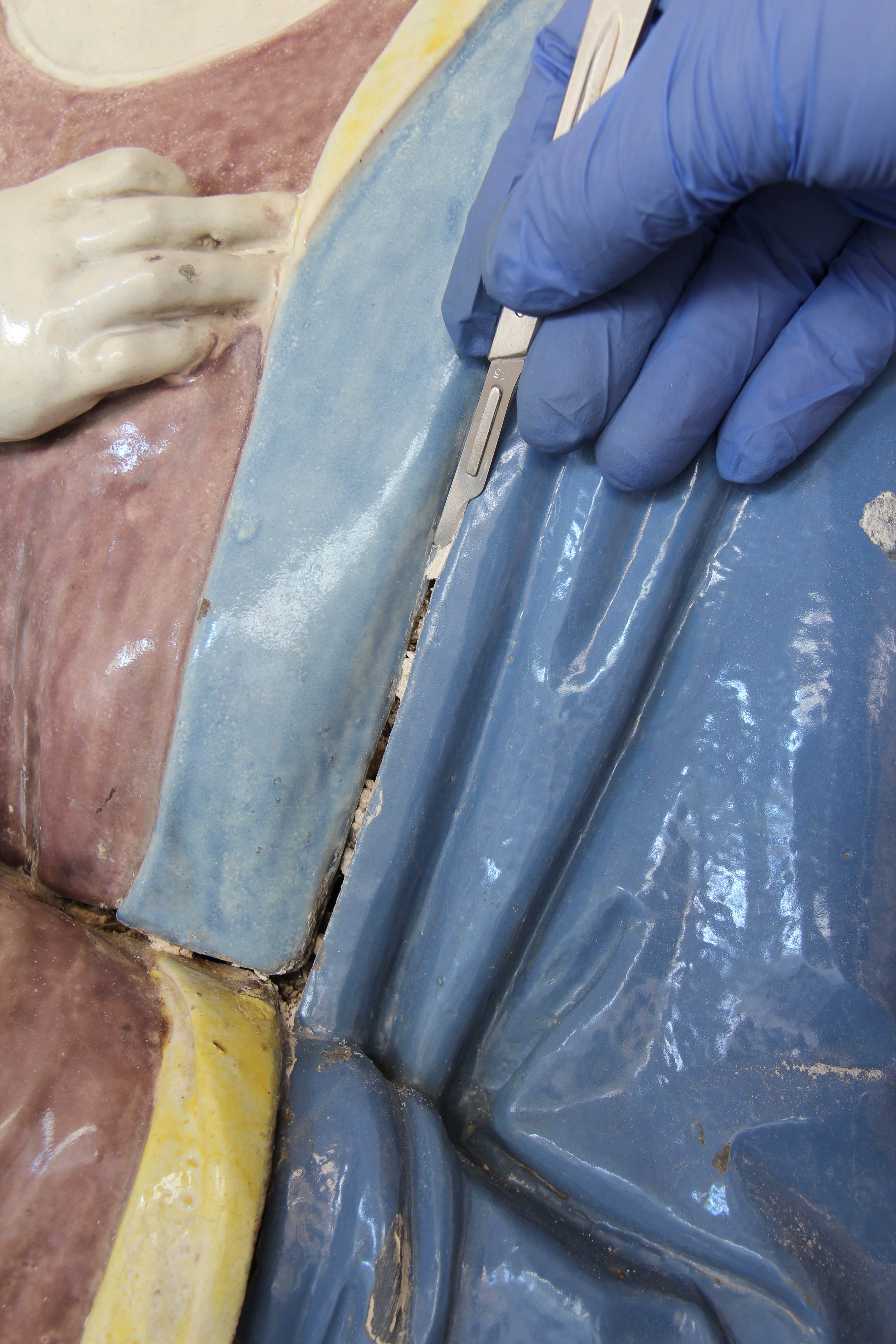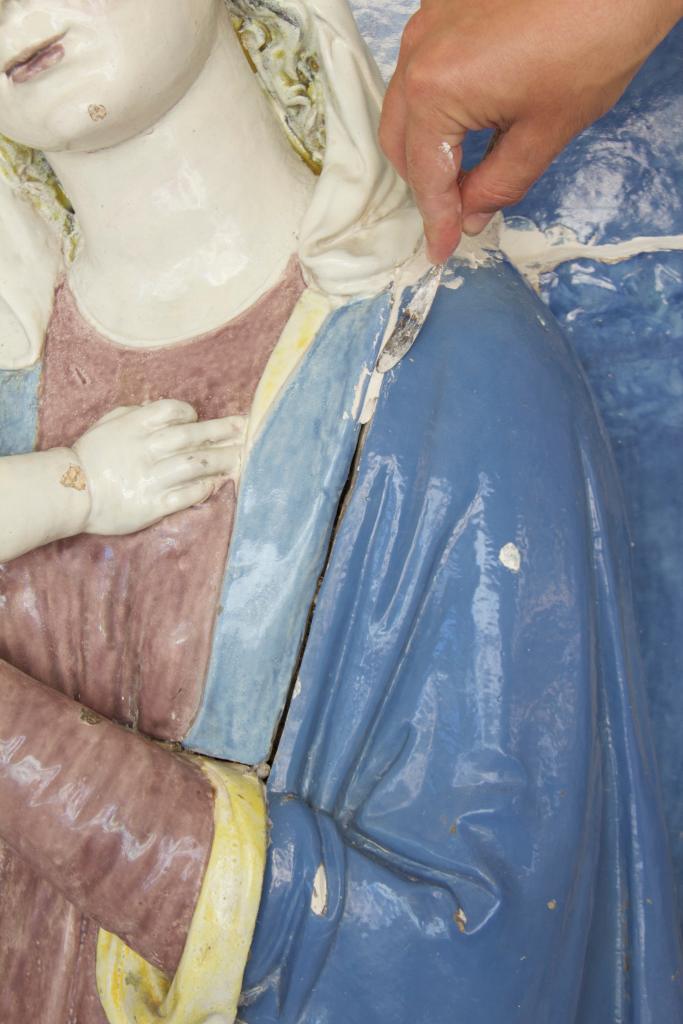 The restoration work on the lunette depicting the Madonna and Child with Saint Francis of Assisi and Saint Ursula was preceded by the pre-consolidation of the partial detachments of the enamel and the ceramic body, after which a reduction of the altered grouting was carried out .