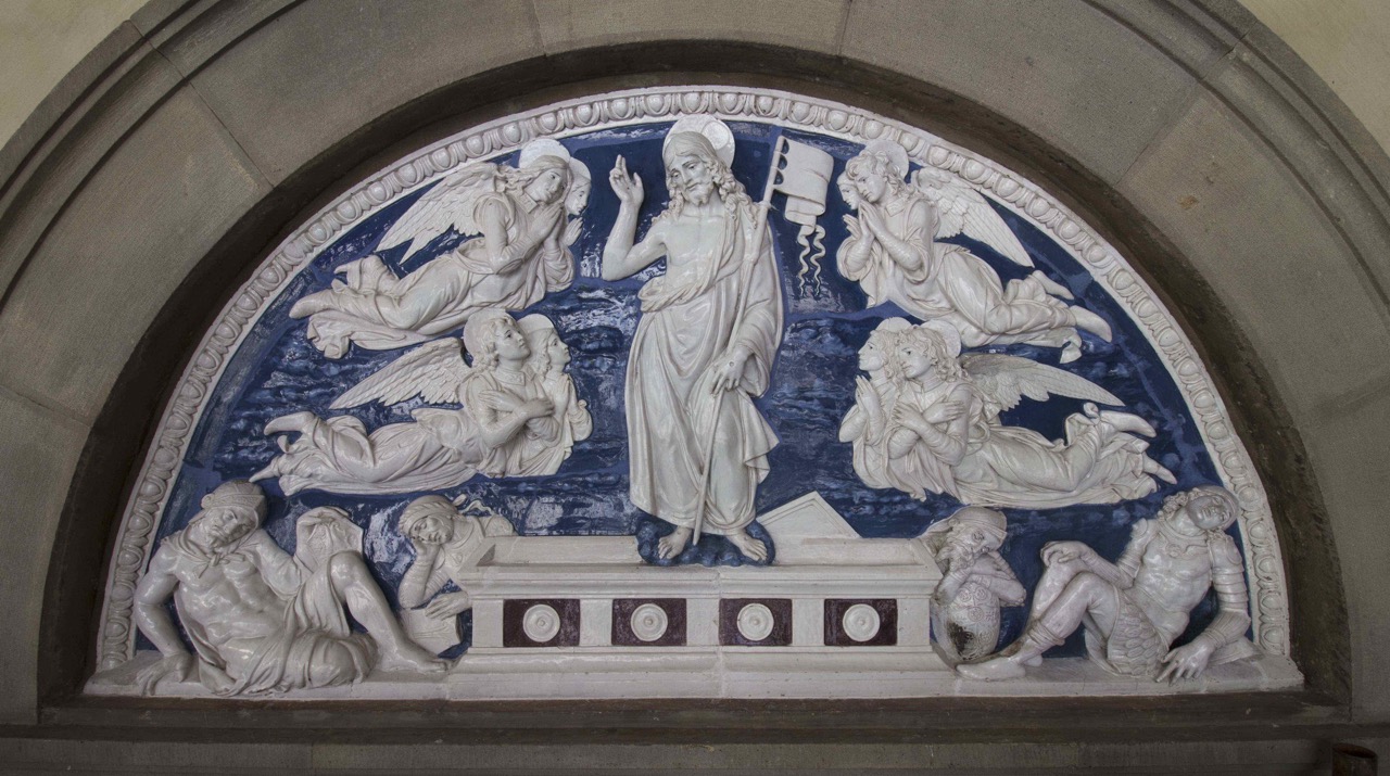 The second restored lunette is instead the one closest to the Accademia Gallery and represents the Resurrection of Christ with the figure of Christ in the center, surrounded by eight angels, while he rests his feet on the sarcophagus on the sides of which there are two crouched soldiers resting .