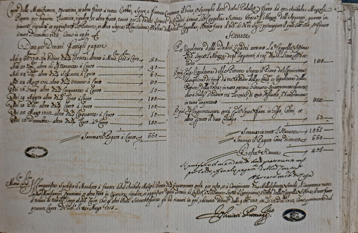 “Conto delle Manifatture, operationi, ed altro fatto à tutta robba, spese, e fattura ( eccetto il Greco, e sponghe date dal Sacro Palazzo) fatto dà me Anibale Mazzoli Pittore per havere risarcito, ripulito, ed altro fatto, tanto per le dodici historie de Quadri attorno a la Cappella Sistina sopra l’Altezza dell’Apparati, quanto in havere a ripulite, et aggiustate le Pitture, et altro opra il Cornicione, e Volta della suddetta Cappella…”
