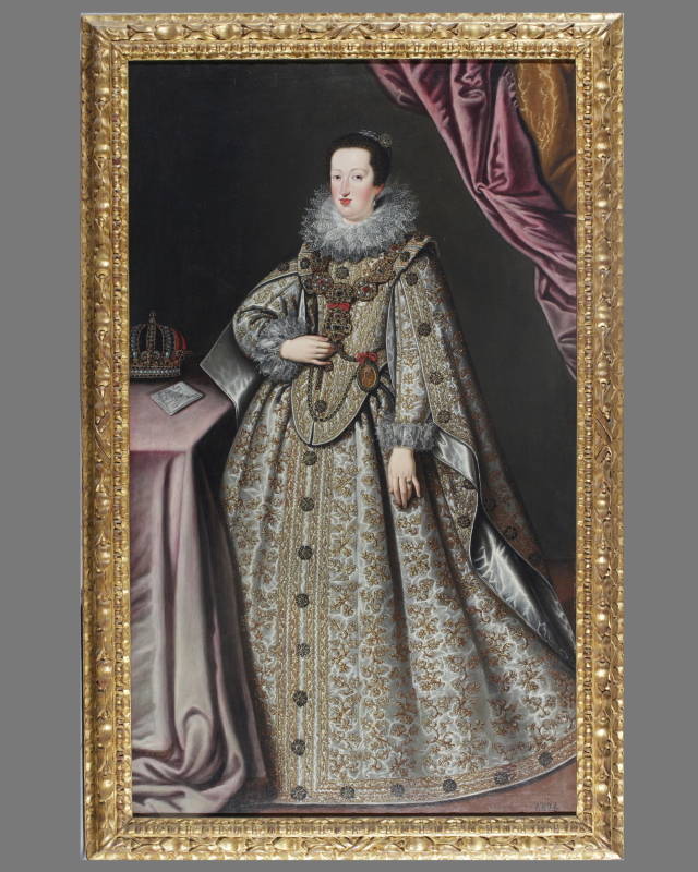 The portrait was made on the occasion of the young woman’s marriage and depicts her in particularly rich and elaborate clothes, in keeping with the role she would have held at the court in Vienna. The dress is in brocade woven with gold threads decorated with lace.
