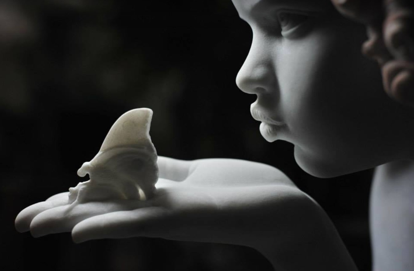 The two large finely crafted wings leave room for the body of the young woman sitting on the block of marble. The red curls frame her face as she fills her cheeks with air to blow on the wings of the creature she carries on the palm of her hand: this is the way she uses to feed their passion.