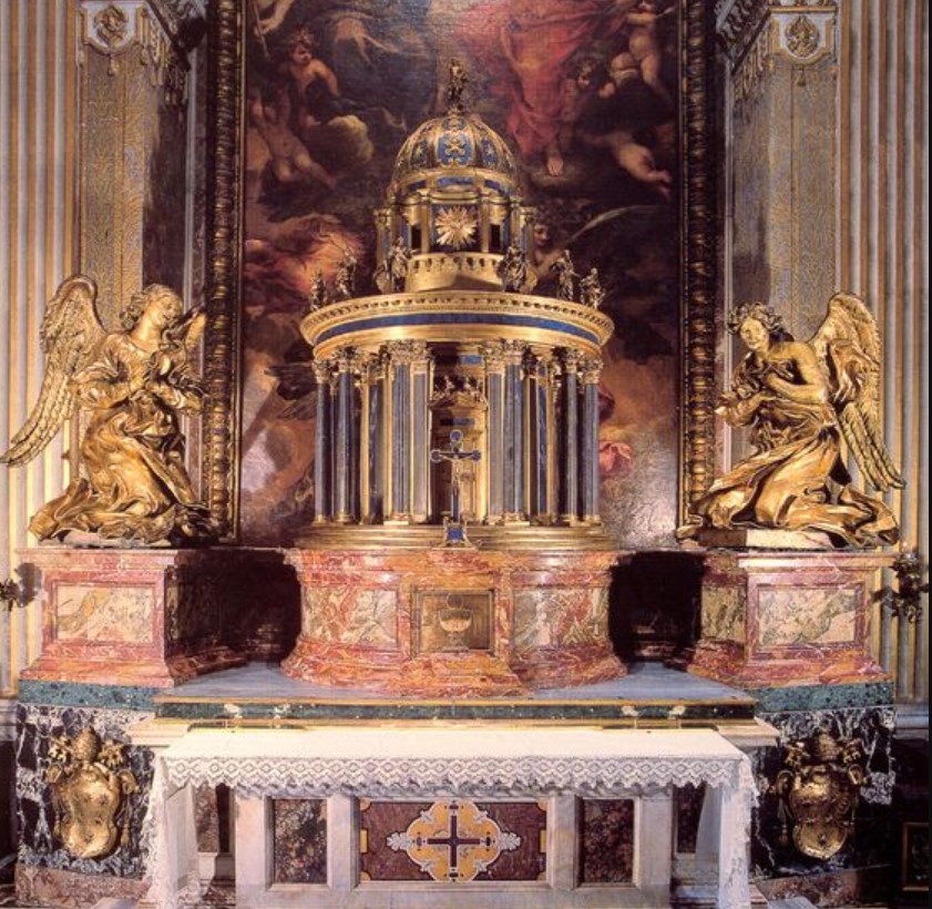 Purtroppo in un secondo momento venne posizionato sull’altare il tabernacolo progettato dal Bernini ma era ed è tutt’oggi talmente voluminoso da celare parte del dipinto con la sfera terrestre che raffigurava Dio come creatore impedendo così una corretta lettura dell’opera di Pietro da Cortona.