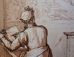 Taddeo is studying the sketched figures of the Last Judgment. The drawing in question belongs to the Galerie de Bayser in Paris.