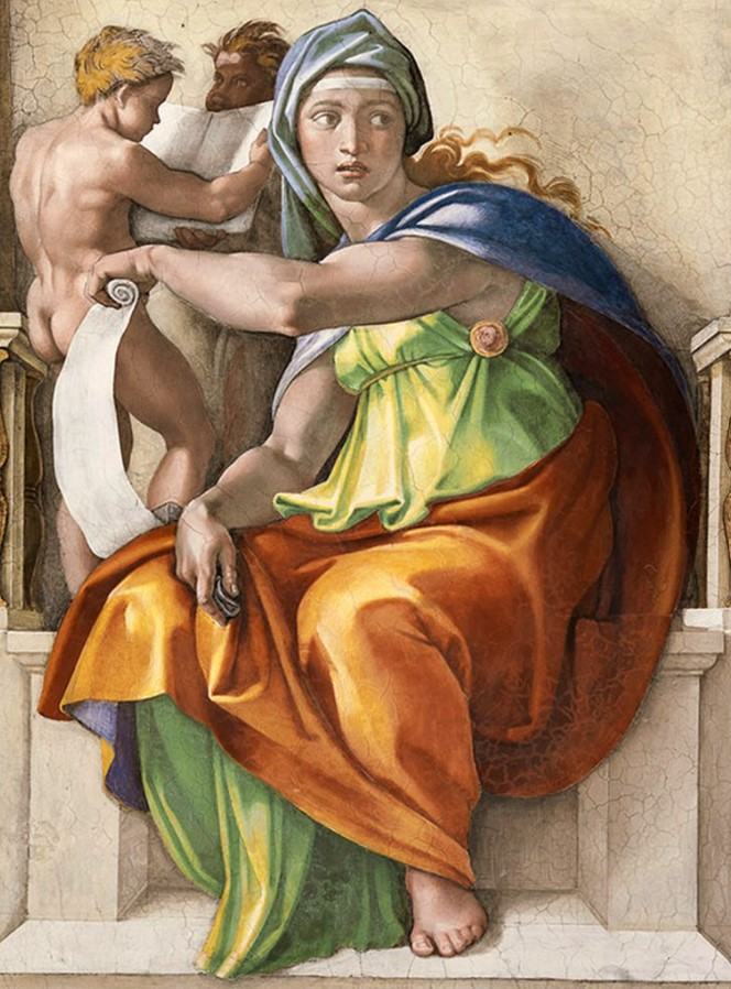 La Sibilla Delfica fu una delle figure che dipinsi nel primo blocco, terminato nel 1510. Dietro di lei ci sono i due assistenti: uno sorregge un libro e l’altro lo legge. Lei invece svolge il rotolo tenuto sulla sinistra mentre volge il corpo in quella direzione con il braccio sinistro sollevato. Ha uno sguardo sorpreso per metà in luce e per metà in ombra. La sua meraviglia è forse causata dalla venuta di Cristo, predetta anche da lei?