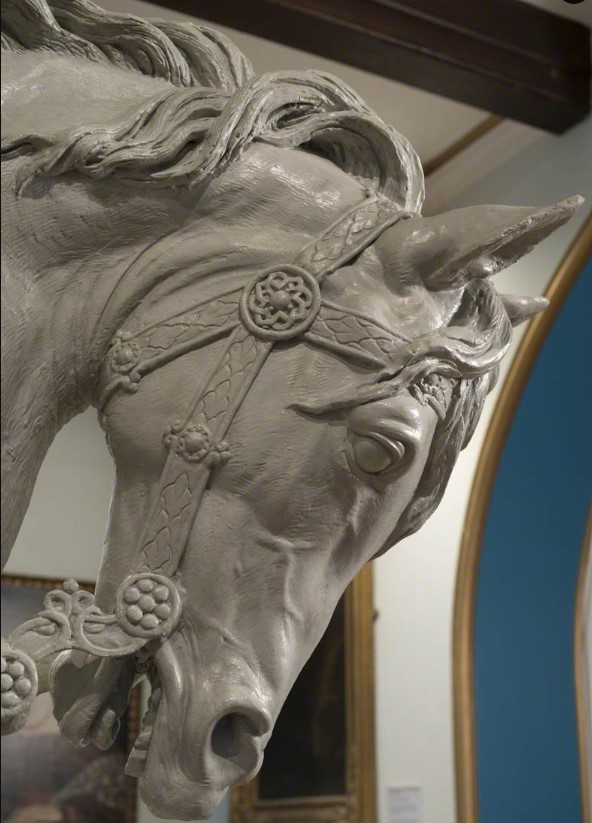 Il cavallo scolpito da Jhon Thomas invece mostra fiero il petto e ha la testa protesa. Le redini finemente lavorate e la criniera mossa dal vento sono straordinarie.