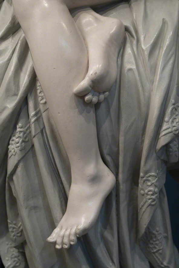 She even tries to hide behind her long hair that we know from legend to be golden, partially braided. Godiva’s despair is total and although she was celebrated as a heroine, she has nothing bold and heroic in her attitude.
