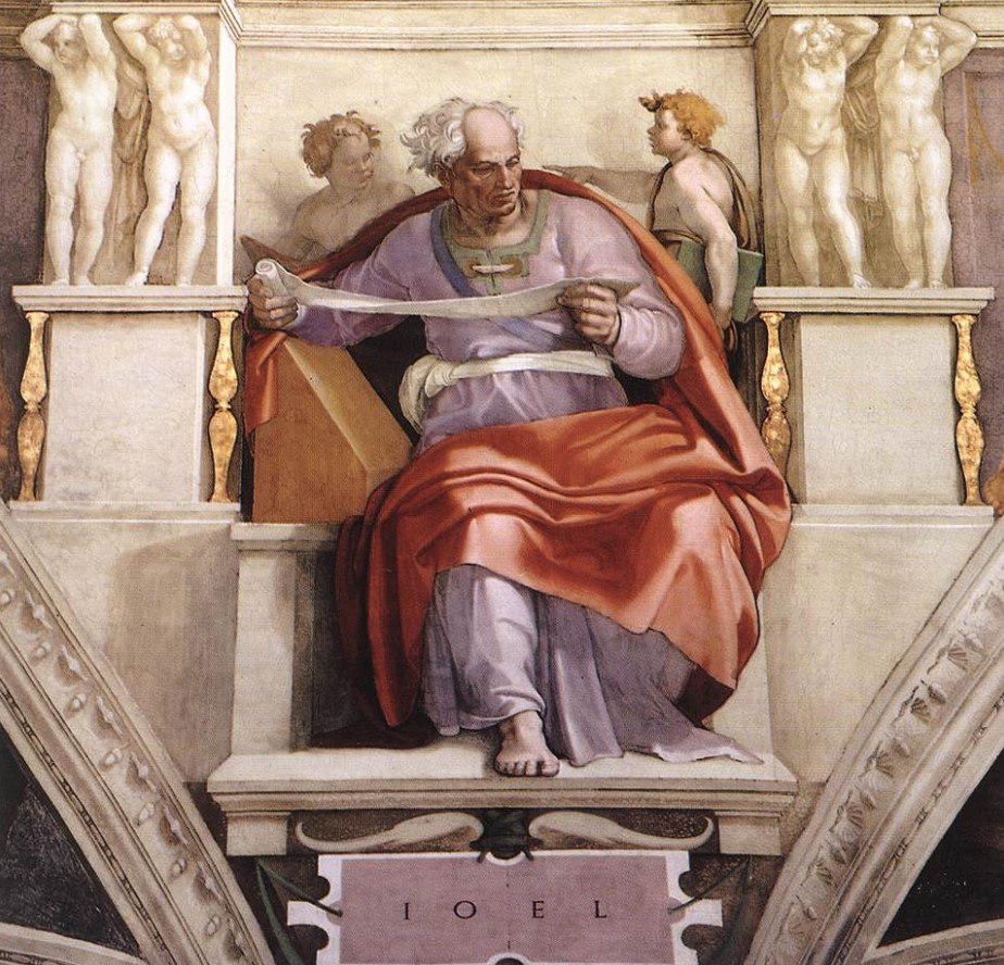 Gioele è uno dei sette profeti che affrescai nella volta della Cappella Sistina nel 1509. Si trova al lato del riquadro dell’Ebbrezza di Noè, proprio al di sotto del grande tino e dalla parte opposta della Sibilla Delfica.