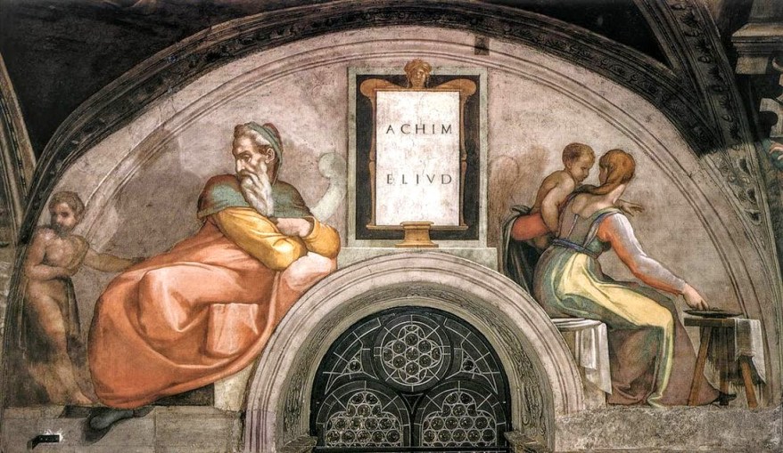 Gioele è uno dei sette profeti che affrescai nella volta della Cappella Sistina nel 1509. Si trova al lato del riquadro dell’Ebbrezza di Noè, proprio al di sotto del grande tino e dalla parte opposta della Sibilla Delfica.