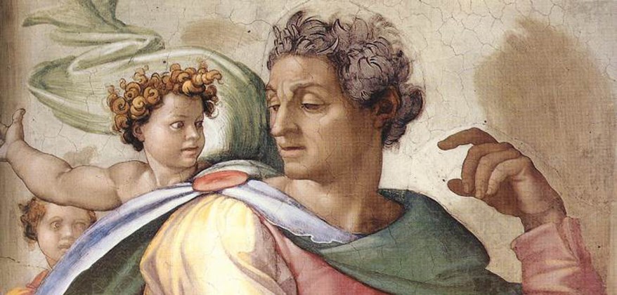 Gioele è uno dei sette profeti che affrescai nella volta della Cappella Sistina nel 1509. Si trova al lato del riquadro dell’Ebbrezza di Noè, proprio al di sotto del grande tino e dalla parte opposta della Sibilla Delfica.