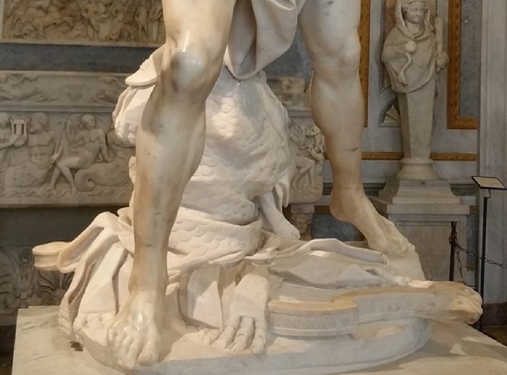 Osservate la presenza della cetra a terra: è quella che verrà suonata dopo l’esito vittorioso di David. Non è affatto un caso che sia decorata con una testa di aquila: l’aquila e il drago erano gli animali araldici della famiglia Borghese.